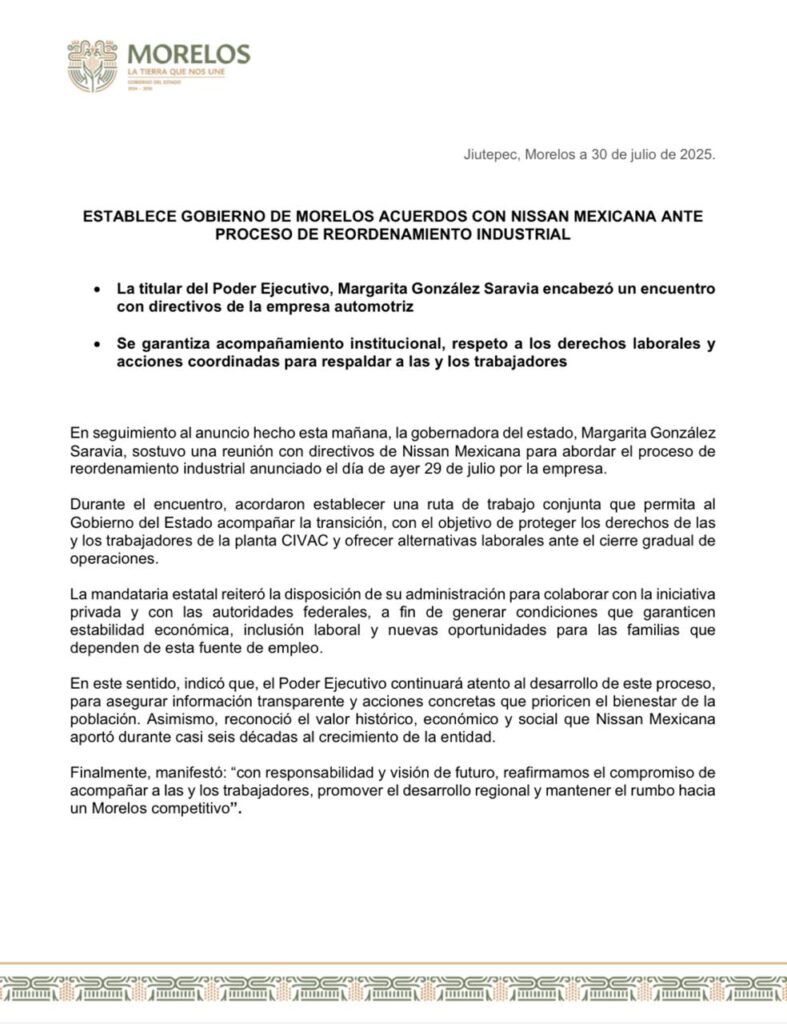 En este sentido, indicó que, el Poder Ejecutivo continuará atento al desarrollo de este proceso, para asegurar información transparente y acciones concretas que prioricen el bienestar de la población. Asimismo, reconoció el valor histórico, económico y social que Nissan Mexicana aportó durante casi seis décadas al crecimiento de la entidad.