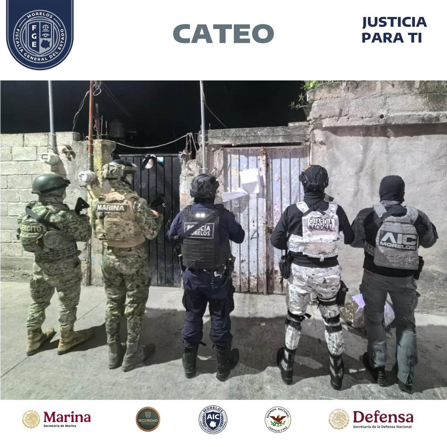 La diligencia fue encabezada por personal de la AIC y contó con el apoyo de elementos de la Secretaría de Marina, Defensa Nacional (Defensa), Guardia Nacional (GN) y Secretaría de Seguridad y Protección Ciudadana (SSPC) Morelos, quienes intervinieron una casa en la colonia Centro.